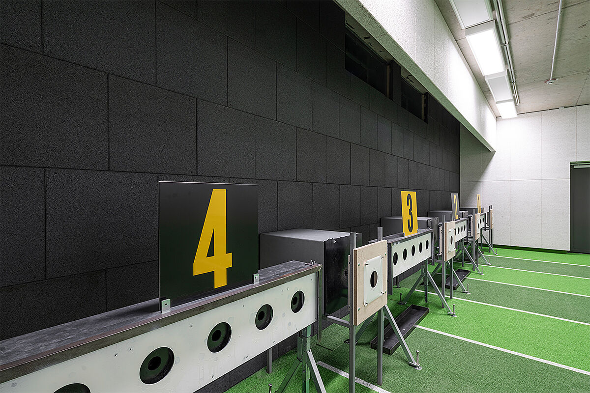 In addition, REGUPOL ballistic E43 elastic panels in black were installed on the rear wall of the hall. This wall cladding provides additional protection against potential ricochets.